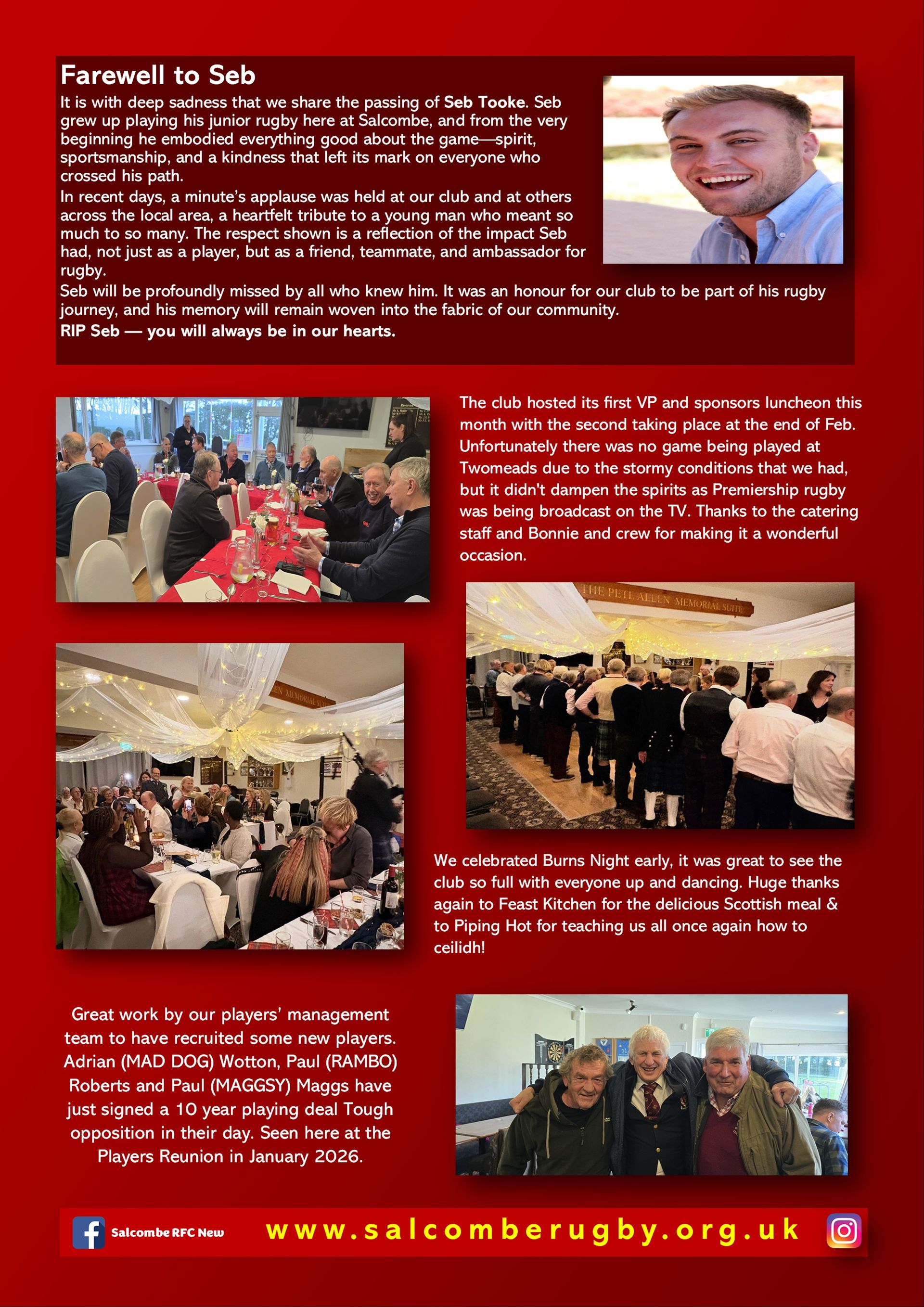 Celebration of the Life of Seb Tooke The family of Seb Tooke warmly invites all who knew and loved him to join us for a Celebration of his Life on Friday, 23rd January. The service will begin at 3:00 PM at The Holy Trinity Church, Salcombe. In true Seb Tooke style, we will then raise a glass together at The King’s Arms to share memories and celebrate his life. Dress Code: Rugby shirts encouraged, for those who wish — in recognition of Seb’s love of the game. In lieu of flowers, donations are welcomed to CALM (Campaign Against Living Miserably), an incredible charity dedicated to preventing suicide. https://seb-tooke1.muchloved.com/ All of us at Salcombe RFC and far beyond are deeply saddened to hear about the passing of Seb Tooke. He began his Rugby journey with the Crabs as a mini and went on to achieve amazing things on the pitch. He touched the lives of so many along the way. I am sure that many of you will have already seen tributes to Seb and I would like to echo every sentiment made in them. I know I can speak on behalf of everyone who has played with him when I say what a truly amazing human being and rugby player Seb was. The kind of bloke who would run through a brick wall for the team and would give 100% in everything he did. Having scrummaged directly behind him for so many years, I can tell you first hand what an absolute titan he was. Where he shone so brightly on the pitch, he shone equally brightly off it. His ear to ear grin and infectious laugh would instantly brighten any room he entered. He was one of the kindest, funniest and most caring people you could ever wish to meet. One of the best, gone far too soon. In recognition of this, we will be holding a minutes applause prior to Kick Off in our game at home to Plymouth Argaum this Saturday. We will also be taking donations to CALM (Campaign Against Living Miserably), the charity chosen by Seb’s family. In the wake of this utterly tragic loss, please look out for those around you and remember that it’s good to talk, especially if you’re feeling down or worried about anything. Whatever happens out there Seb, you’ll always be my tight head buddy. Fly high brother, Dodsy❤️🤍