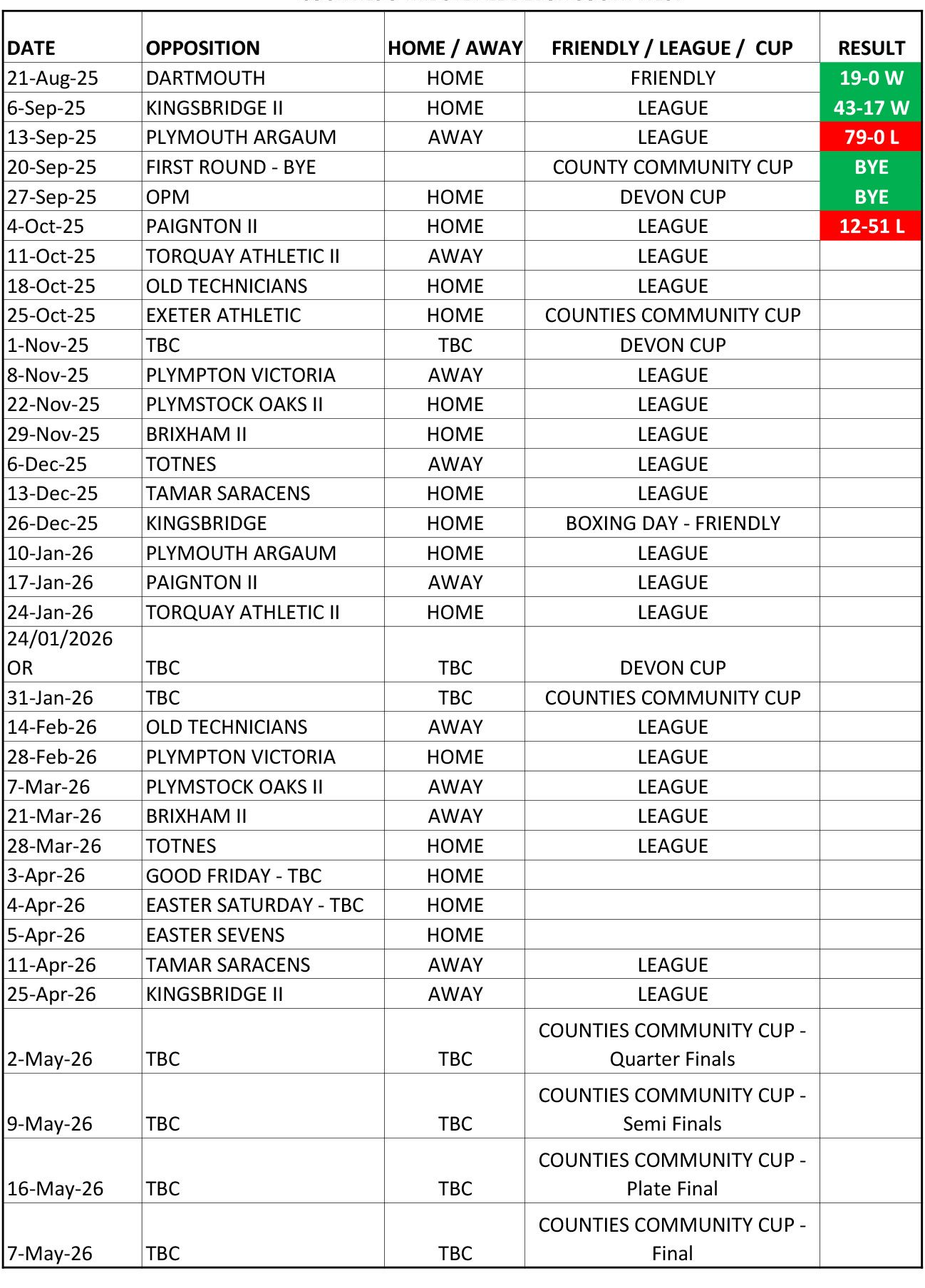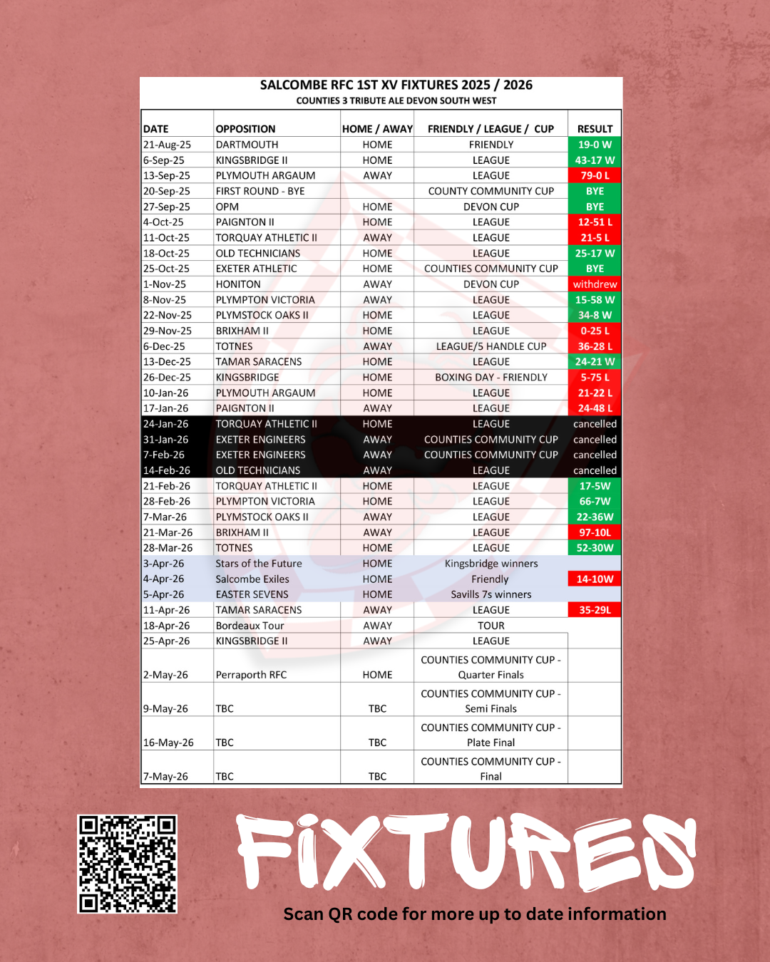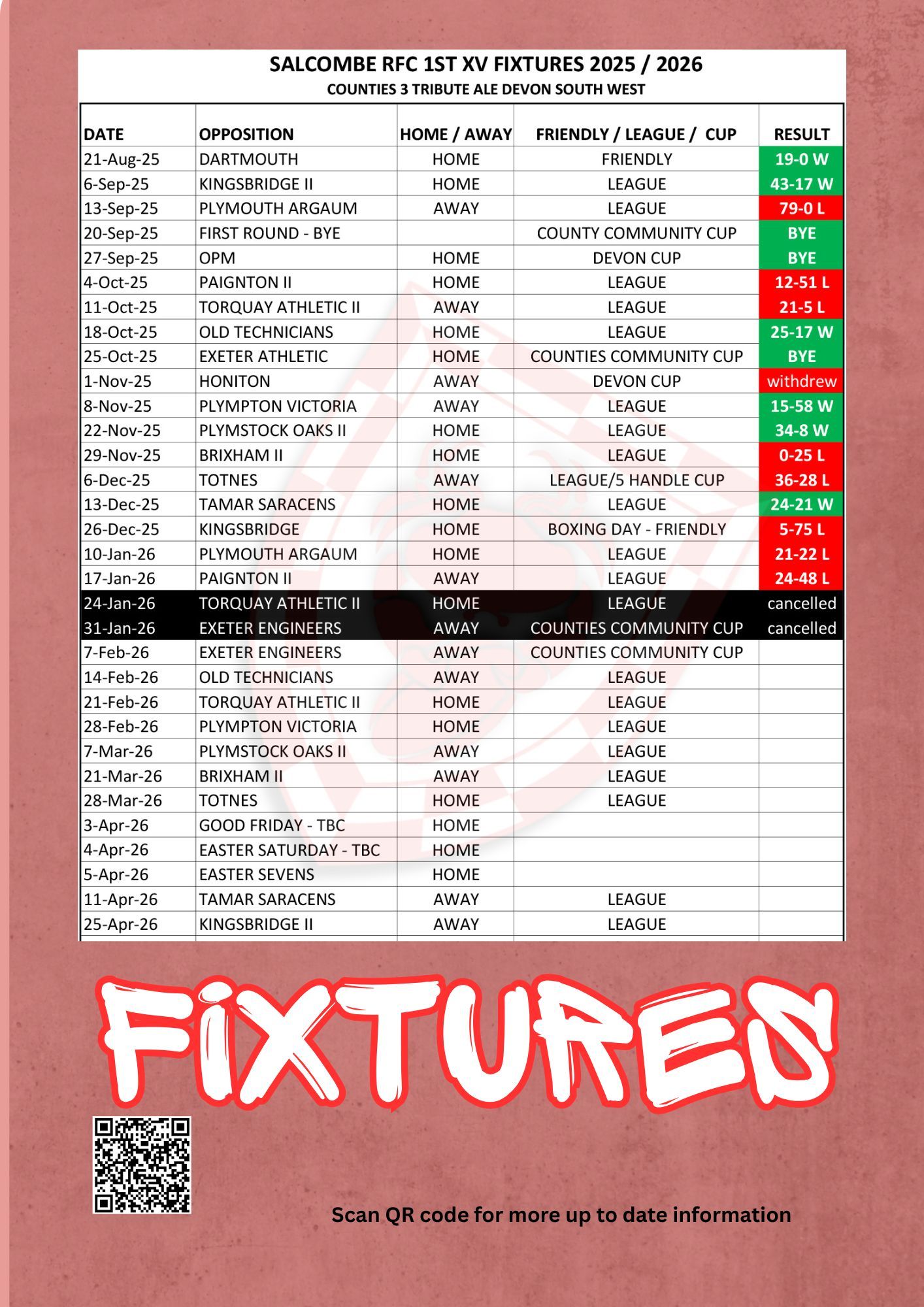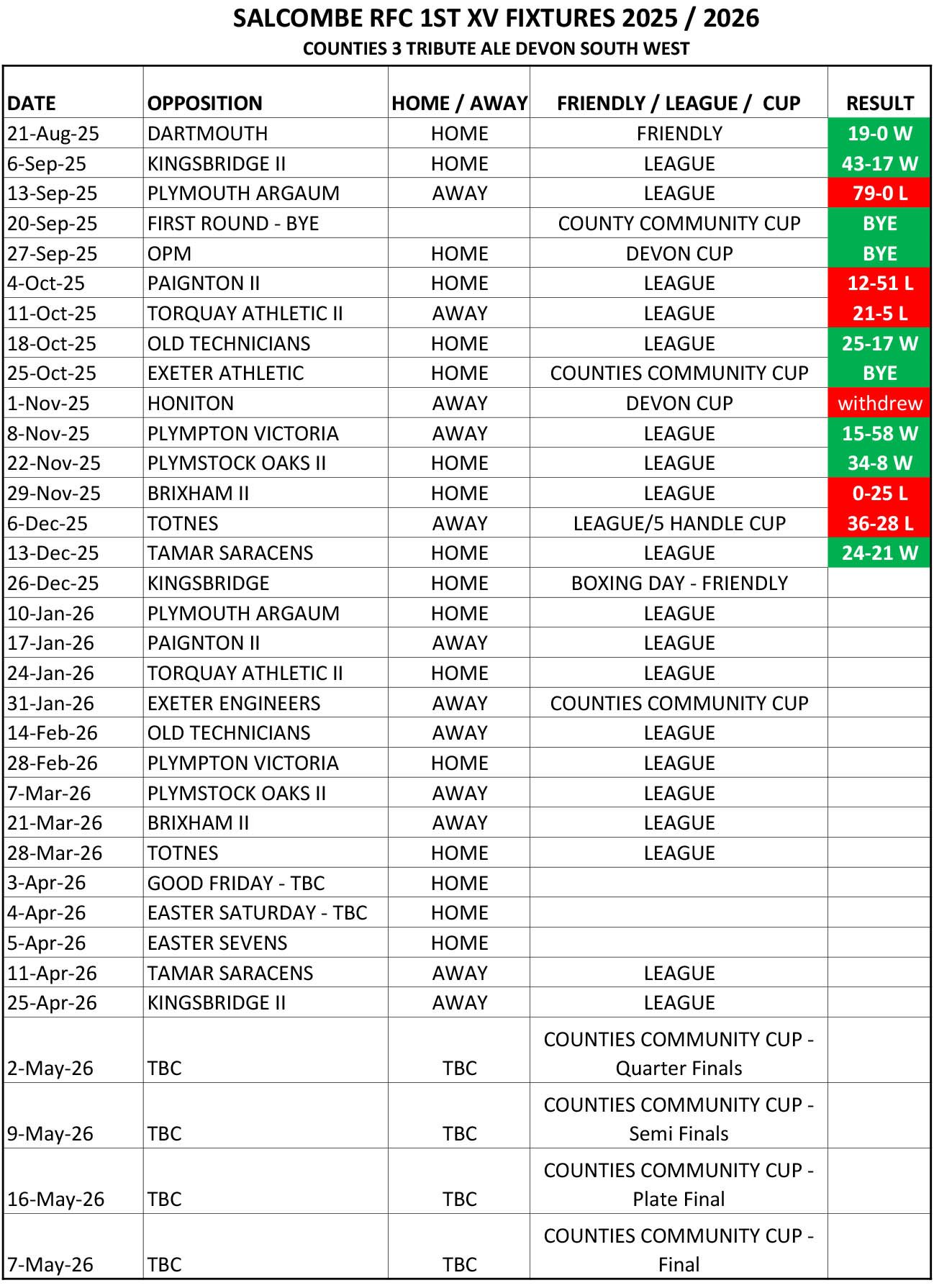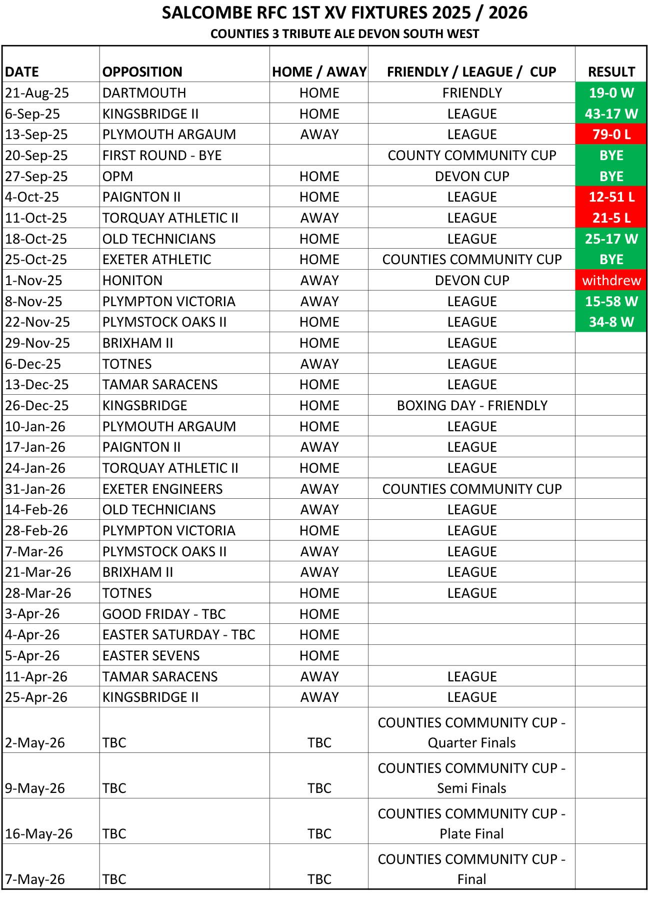 We have added a direct link to the Fixtures, Results, Table and Statistics for the Salcombe Rugby Club below.