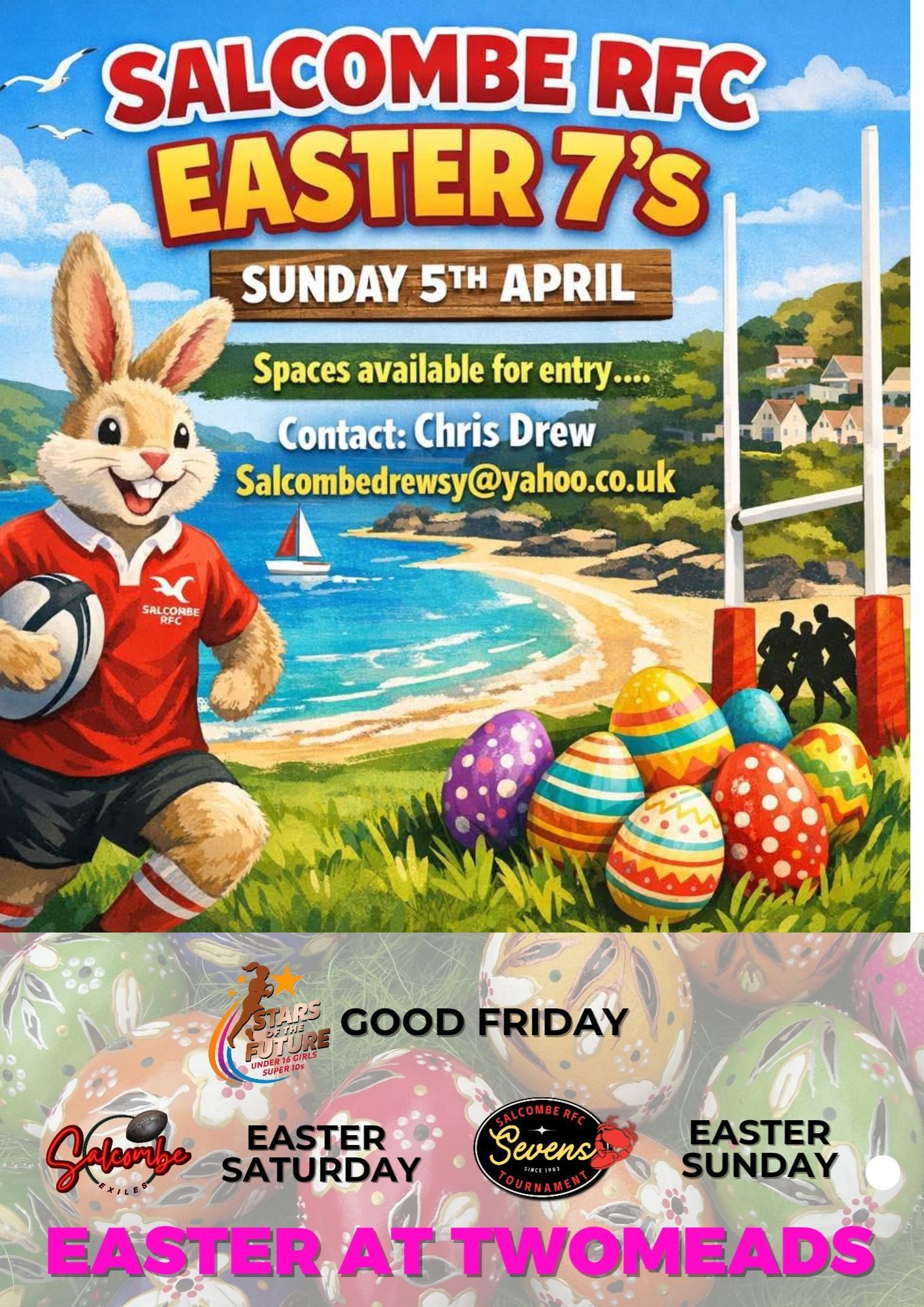 3-5th April EASTER AT TWOMEADS Join us with a fun packed weekend over the Easter period. Friday sees a new event with numerous youngsters taking part in the Stars of the Future . Girls aged 15-16 take part in a tournament much like the 7s tournament which has been running since 1983. Saturday sees the return of old faces for the annual Salcombe v Exiles fixture. which kicks off at 3.00pm. Sunday, once again sees teams from near and far take place in our Sevens Tournament with Salcombe becoming victorious back in 1990.
