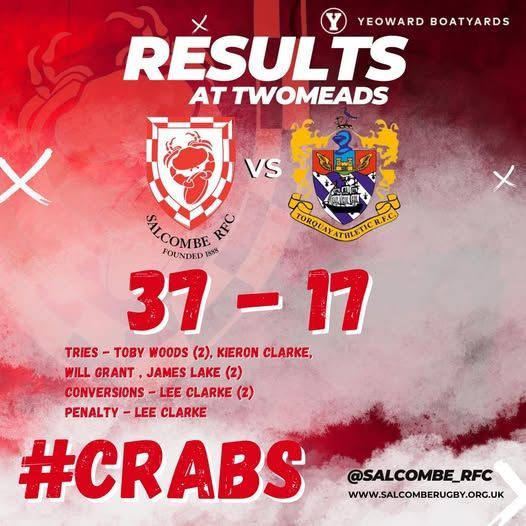 Facing the wind the Crabs knew they had to keep the game tight and although outweighed in the pack, they were ferocious in the tackle area winning a number of turnovers. But Torquay used the wind well and set up a position from which their speedy wing ran 60 metres or more for a superb individual try under the posts which they converted to make the score 27-17. Salcombe then tried to use a kicking game to win territory but in the wind this proved fruitless and a better ploy would have been to run it and go through the phases. Eventually the penny dropped and rewarded Salcombe with 2 further tries, neither converted, with a second for Lake and an amazing one from Will Grant coming off the bench in his first appearance after long term injury problems. Playing in the pack he took the ball on the wing, what was he doing there, and from 25 metres out jinked his way over for the most spectacular of Salcombe's scores and bringing the final total to 37-17.